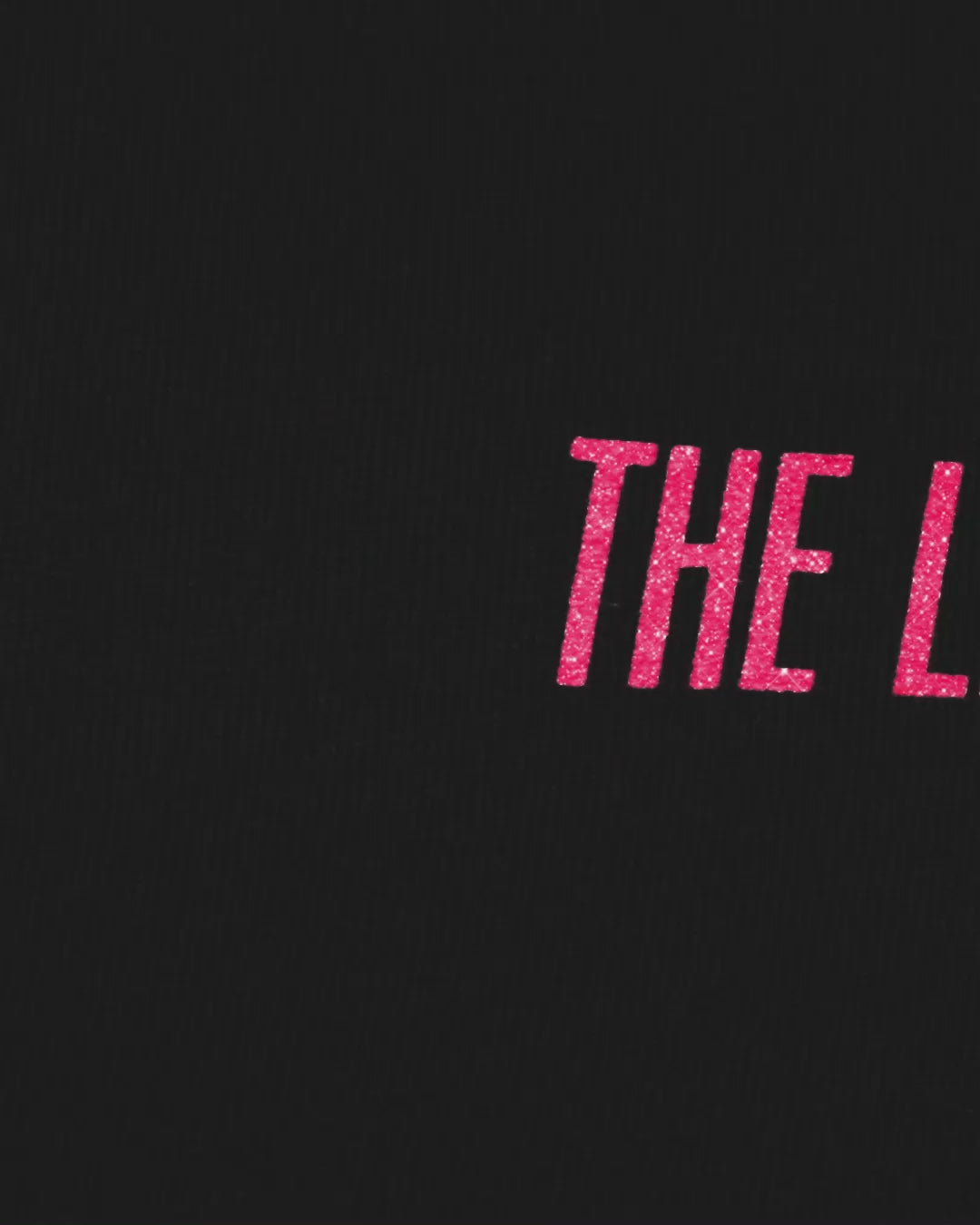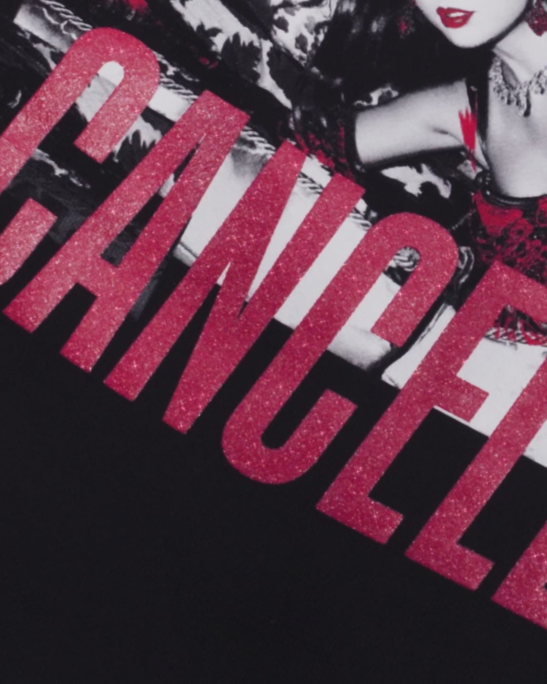 BLACK HOODIE FEATURING "THE LIFE OF A SHOWGIRL" ALBUM LOGO IN RED SPARKLE PRINT ON FRONT AND "I LIKE MY FRIENDS CANCELLED!" SONG LYRICS IN RED SPARKLE WITH PHOTO OF TAYLOR SWIFT PRINTED ON BACK.