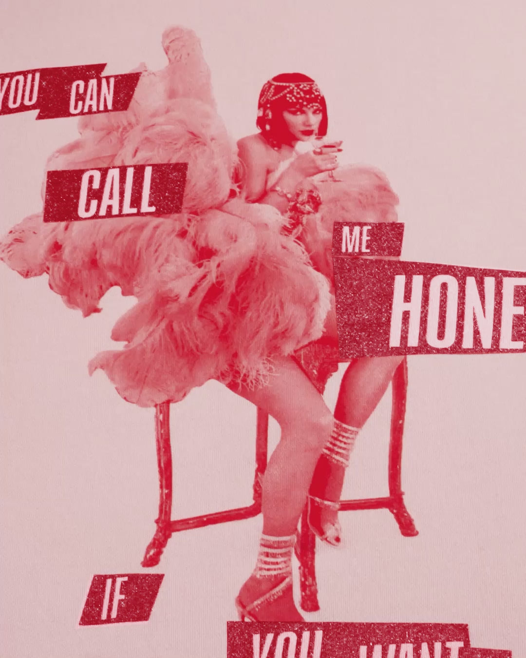 PINK LONG SLEEVE CREWNECK SWEATSHIRT FEATURING "THE LIFE OF A SHOWGIRL" ALBUM LOGO IN RED GLITTER PRINT ON FRONT AND "YOU CAN CALL ME HONEY IF YOU WANT" SONG LYRICS IN RED GLITTER WITH PHOTO OF TAYLOR SWIFT PRINTED ON BACK.